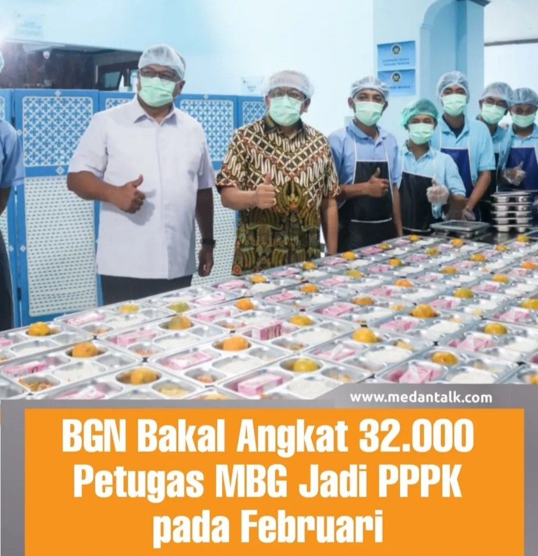 Kepala Badan Gizi Nasional Dadan Hidayana menyebut 32.000 pegawai Satuan Pelayanan Pemenuhan Gizi akan dilantik menjadi Pegawai Pemerintah dengan Perjanjian Kerja (PPPK) pada 1 Februari 2026.