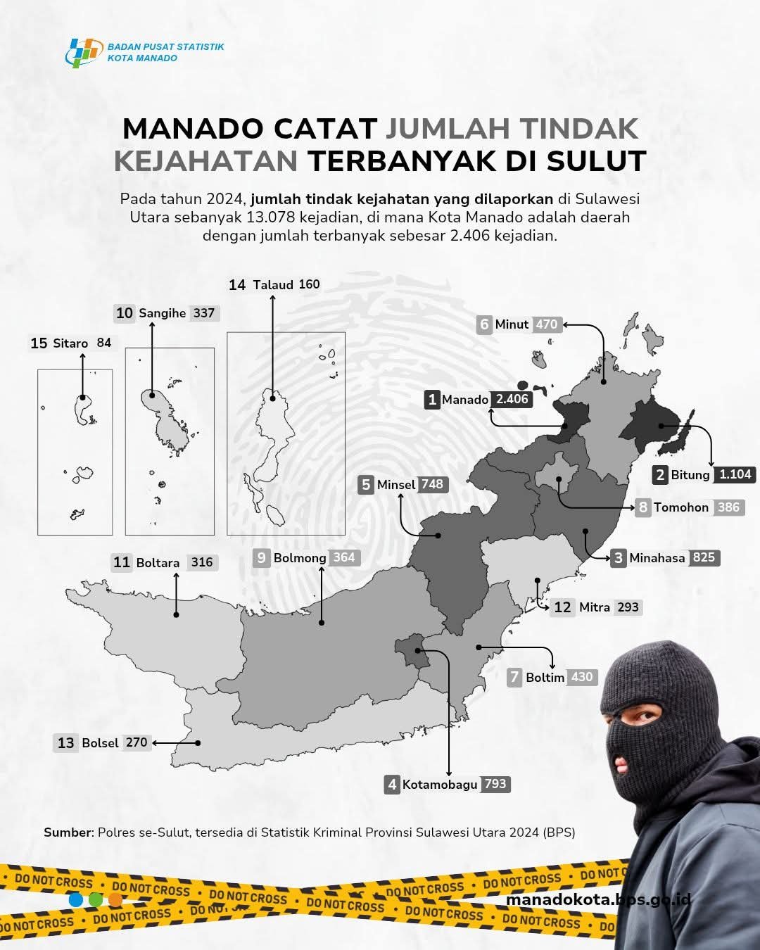 Meski demikian, Kota Manado masih mencatat jumlah tindak kejahatan tertinggi di antara kabupaten dan kota di Sulut, dengan total 2.406 kejadian. Posisi berikutnya ditempati Kota Bitung dan Kabupaten Minahasa.