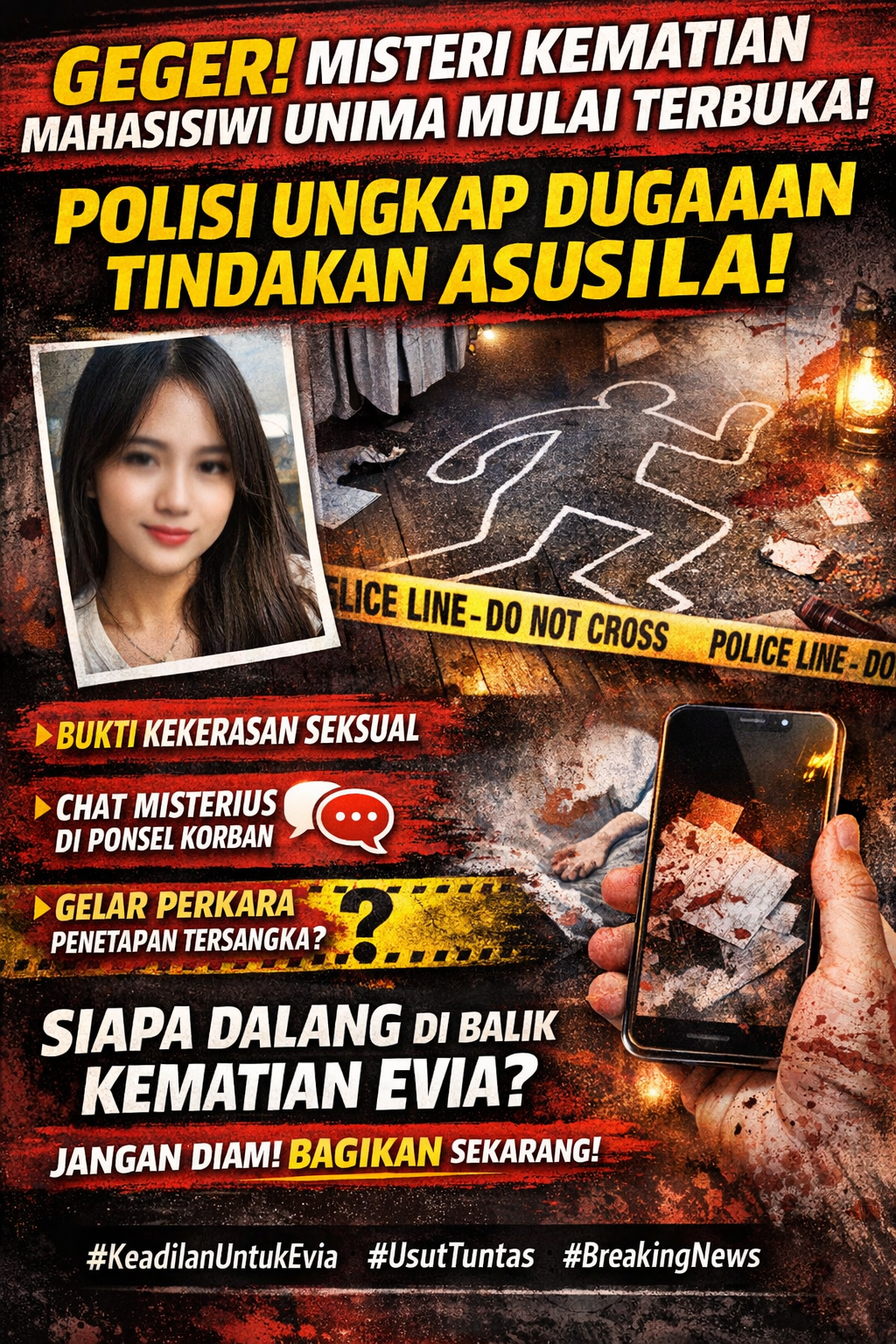 Kasus kematian Evia, mahasiswi Universitas Negeri Manado (UNIMA) yang ditemukan meninggal secara tidak wajar di kamar indekosnya di Kota Tomohon beberapa waktu lalu, mulai menemukan titik terang.