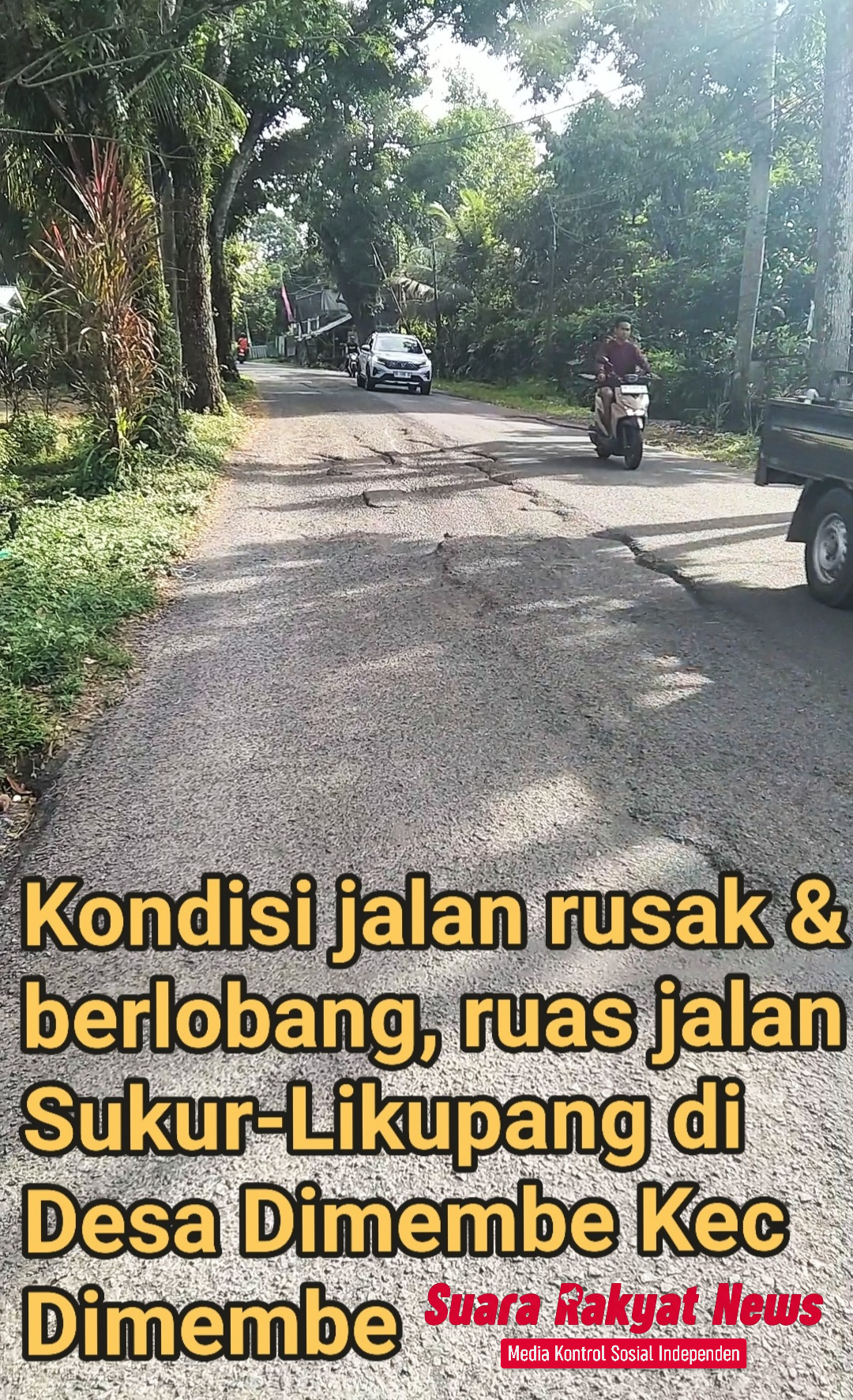 Kondisi jalan rusak dan berlubang di Jalan Raya Sukur–Likupang, tepatnya di Desa Dimembe, Kecamatan Dimembe, Kabupaten Minahasa Utara, Sulawesi Utara, hingga kini belum mendapat perbaikan.