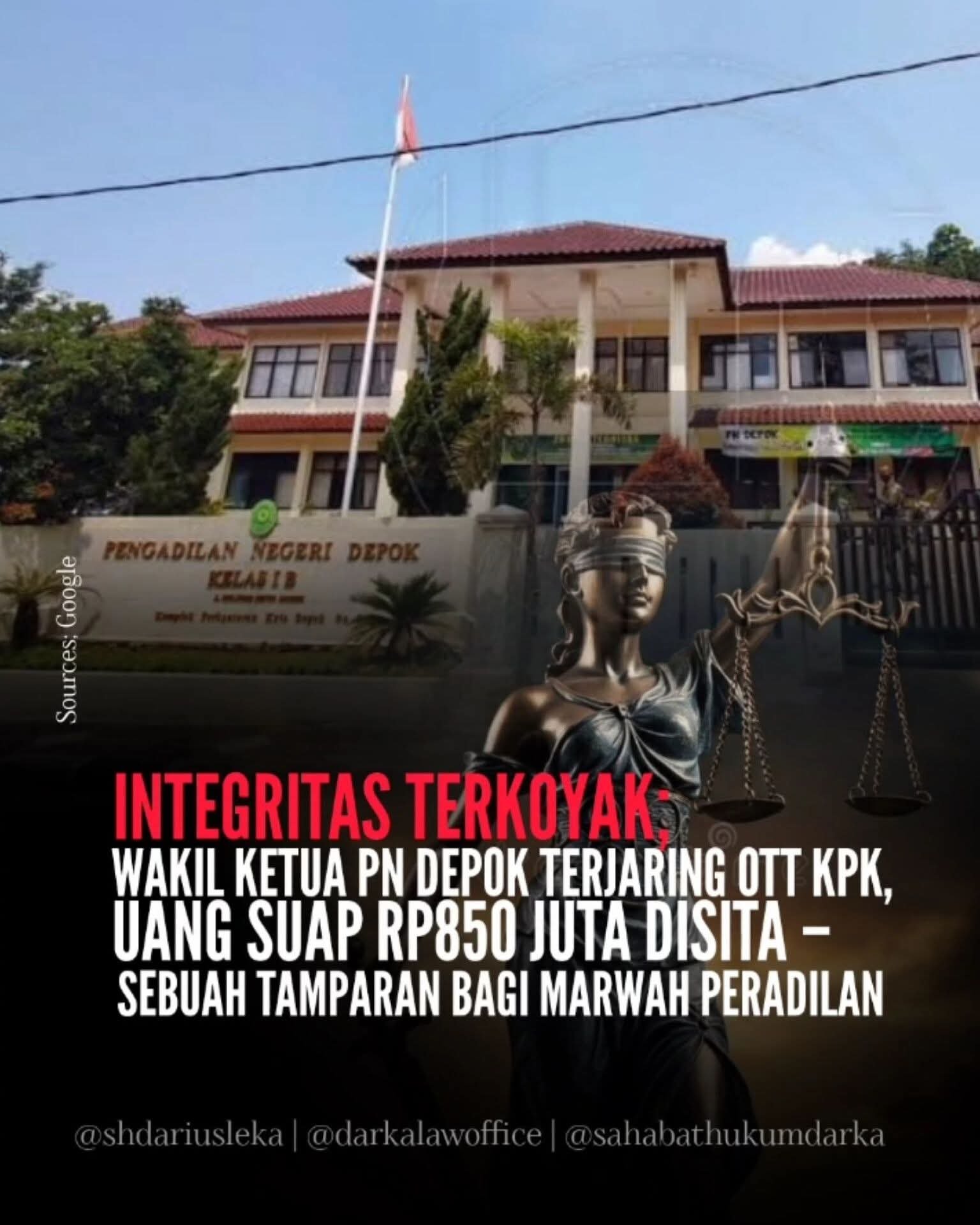 KOTA DEPOK, 6 Februari 2026 – Komisi Pemberantasan Korupsi (KPK) kembali mengguncang publik lewat Operasi Tangkap Tangan (OTT) terhadap Wakil Ketua Pengadilan Negeri Depok, Bambang Setyawan, Kamis (5/2/2026) malam. Dalam operasi tersebut, penyidik menyita uang tunai Rp850 juta yang diduga kuat terkait praktik suap perkara.