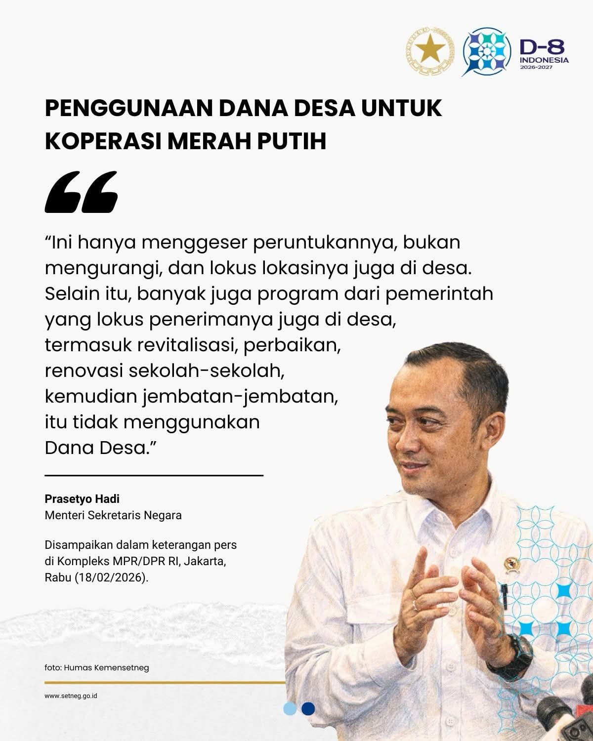 Prasetyo Hadi menyampaikan, penggunaan Dana Desa untuk Koperasi Merah Putih bukanlah bentuk pengurangan anggaran bagi desa, melainkan penggeseran peruntukan agar lebih tepat sasaran dan efektif.