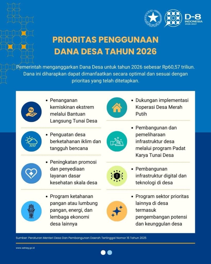 Pemerintah resmi menetapkan prioritas penggunaan Dana Desa tahun 2026 dengan total anggaran sebesar Rp60,57 triliun. Dana tersebut difokuskan untuk mendukung pemulihan ekonomi dan peningkatan kesejahteraan masyarakat desa.