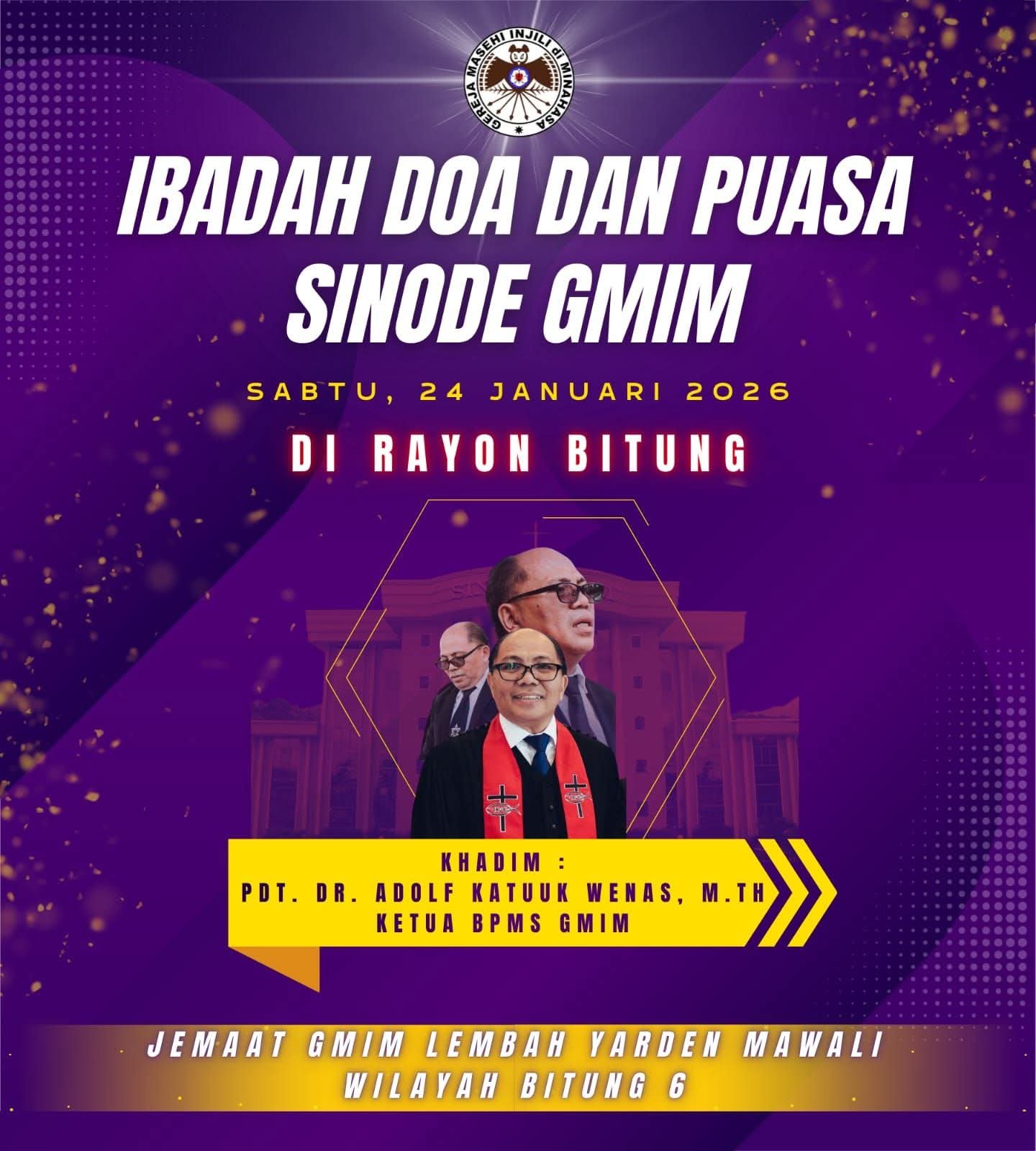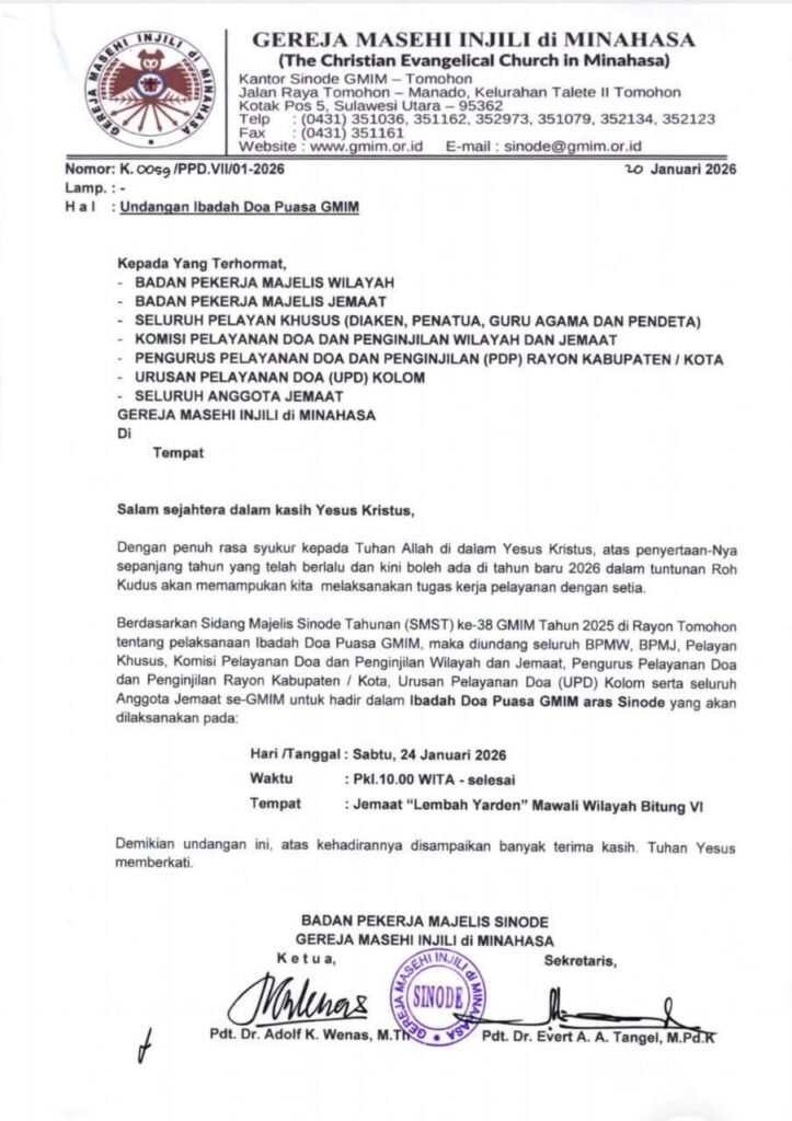 Bitung – Dalam ketaatan pada kehendak Allah dan kesadaran akan panggilan gereja sebagai tubuh Kristus di dunia, Sinode Gereja Masehi Injili di Minahasa (GMIM) akan melaksanakan Ibadah Doa dan Puasa pada Sabtu, 24 Januari 2026 bertempat di Jemaat GMIM Lembah Yarden Mawali, Wilayah Bitung VI.