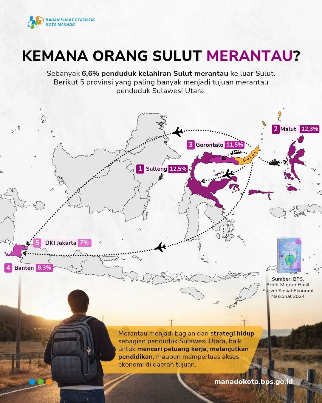 Keputusan untuk merantau menjadi pilihan sebagian penduduk Sulawesi Utara dalam menghadapi dinamika kehidupan. Berdasarkan Profil Migran Hasil Survei Sosial Ekonomi Nasional 2024, sebanyak 6,6 persen penduduk kelahiran Sulawesi Utara tercatat merantau ke luar Sulut.